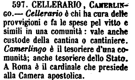 | Cellerario, Camerlingo - Cellerario è chi ha cura delle provvigioni e fa le spese pel vitto e simili in una comunità: vale anche custode della cantina o cantiniere. Camerlingo è il tesoriere d'una comunità; anche tesoriere dello Stato. A Roma è il cardinale che presiede alla Camera apostolica. [immagine] |