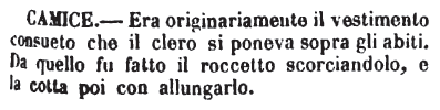 Camice - Era originariamente il vestimento consueto che il clero si poneva sopra gli abiti. Da quello fu fatto il roccetto scorciandolo, e la cotta poi con allungarlo. [immagine]