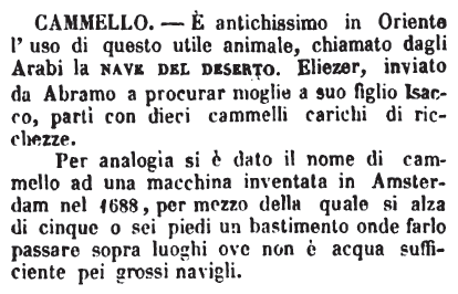 Per analogia si è dato il nome di cammello ad una macchina inventata in Amsterdam nel 1688, per mezzo della quale si alza di cinque o sei piedi un bastimento onde farlo passare sopra luoghi ove non è acqua sufficiente pei grossi navigli. [immagine] |