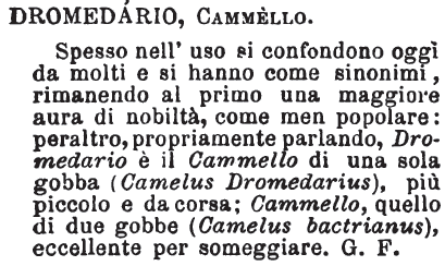 | Dromedario, Cammello - Spesso nell'uso si confondono oggi da molti e si hanno come sinonimi, rimanendo al primo una maggiore aura di nobiltà, come men popolare: peraltro, propriamente parlando, Dromedario è il Cammello di una sola gobba (Camelus Dromedarius), più piccolo e da corsa; Cammello, quello di due gobbe (Camelus bactrianus), eccellente per someggiare. G. F. [immagine] |