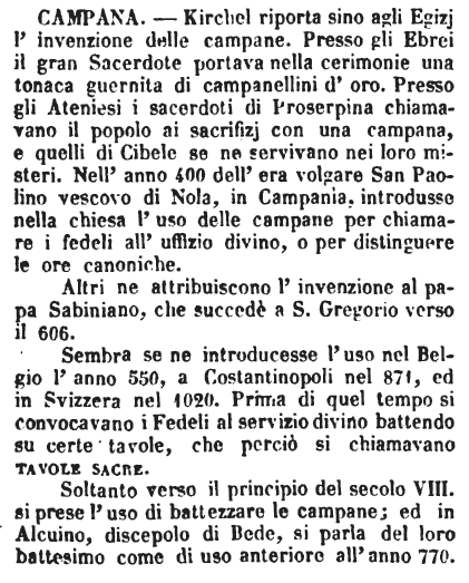 Altri ne attribuiscono l'invenzione al papa Sabiniano, che succedè a S. Gregorio verso il 606. Sembra se ne introducesse l'uso nel Belgio l'anno 550, a Costantinopoli nel 871, ed in Svizzera nel 1020. Prima di quel tempo si convocavano i Fedeli al servizio divino battendo su certe tavole, che perciò si chiamavano tavole sacre. Soltanto verso il principio del secolo VIII. si prese l'uso di battezzare le campane; ed in Alcuino, discepolo di Bede, si parla del loro battesimo come di uso anteriore all'anno 770. [immagine] |