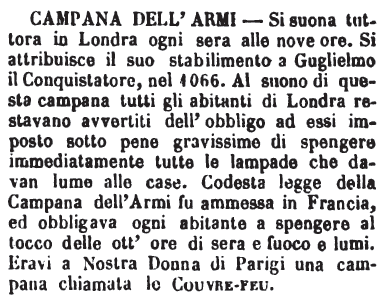 | Campana dell’armi - Si suona tuttora in Londra ogni sera alle nove ore. Si attribuisce il suo stabilimento a Guglielmo il Conquistatore, nel 1066. Al suono di questa campana tutti gli abitanti di Londra restavano avvertiti dell'obbligo ad essi imposto sotto pene gravissime di spengere immediatamente tutte le lampade che davan lume alle case. Codesta legge della Campana dell'Armi fu ammessa in Francia, ed obbligava ogni abitante a spengere al tocco delle ott' ore di sera e fuoco e lumi. Eravi a Nostra Donna di Parigi una campana chiamata le Couvre-feu. [immagine] |