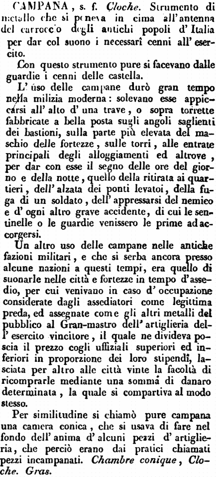 | Campana - s. f. Cloche. Strumento di metallo che si poneva in cima all'antenna del carroccio degli antichi popoli d'Italia per dar col suono i necessarî cenni all'esercito.