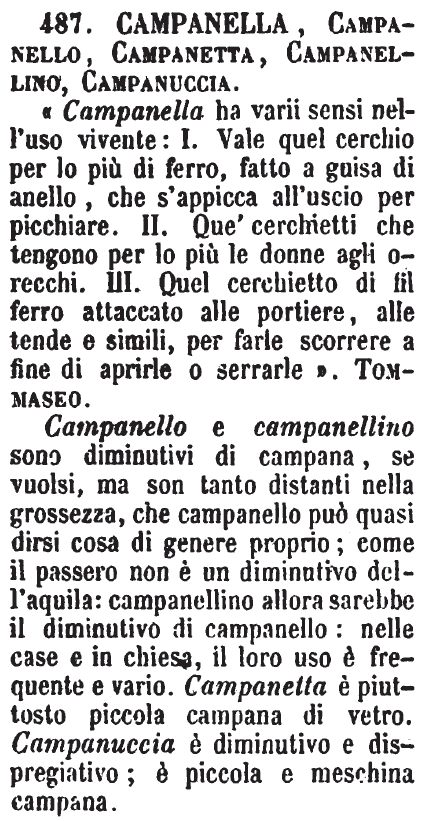 Campanella, Campanello, Campanetta, Campanellino, Campanuccia - « Campanella ha varii sensi nell'uso vivente: I. Vale quel cerchio per lo più di ferro, fatto a guisa di anello, che s'appicca all'uscio per picchiare. II. Que' cerchietti che tengono per lo più le donne agli orecchi. III. Quel cerchietto di fil ferro attaccato alle portiere, alle tende e simili, per farle scorrere a fine di aprirle o serrarle ». Tommaseo.