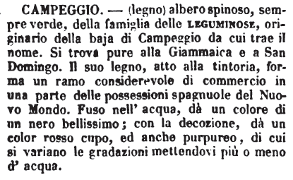 | Campeggio - (legno) albero spinoso, sempre verde, della famiglia delle leguminose, originario della baja di Campeggio da cui trae il nome. Si trova pure alla Giammaica e a San Domingo. Il suo legno, atto alla tintoria, forma un ramo considerevole di commercio in una parte delle possessioni spagnuole del Nuovo Mondo. Fuso nell'acqua, dà un colore di un nero bellissimo; con la decozione, dà un color rosso cupo, ed anche purpureo, di cui si variano le gradazioni mettendovi più o meno d'acqua. [immagine] |