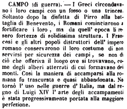 | Campo - Si chiama il luogo, ove truppe che siano in campagna si fermano per prender riposo, e dove si trincerano per essere al coperto dagli attacchi dell'inimico. Il Campo de' Romani era di figura quadra contra il costume dei Greci, che lo facevano tondo.