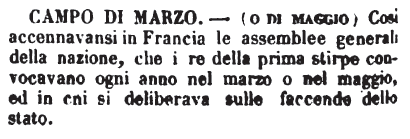| Campo di Marzo - (o di maggio) Così accennavansi in Francia le assemblee generali della nazione, che i re della prima stirpe convocavano ogni anno nel marzo o nel maggio, ed in cui si deliberava sulle faccende dello stato. [immagine] |
