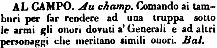 | Al campo - Au champ. Comando ai tamburi per far rendere ad una truppa sotto le armi gli onori dovuti a' Generali e ad altri personaggi che meritano simili onori. Bal. [immagine] |