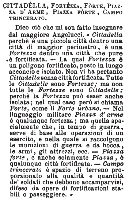 | Cittadella, Fortezza, Forte, Piazza d’Arme, Piazza forte, Campo trincerato - Dico ciò che mi son fatto insegnare dal maggiore Angelucci. «Cittadella perchè è una piccola città dentro una città di maggior perimetro, è una Fortezza dentro una città che pure è fortificata. - La qual Fortezza è un poligono fortificato, posto in luogo acconcio e isolato. Non vi ha pertanto Cittadella senza città fortificata. Tutte le Cittadelle sono Fortezze; ma non tutte le Fortezze sono Cittadelle; perchè la Fortezza può esser anche isolata; nel qual caso però si chiama Forte, come il Forte urbano. - Nel linguaggio militare Piazza d'arme è qualunque fortezza; ma quella specialmente che, in tempo di guerra, serve di base alle operazioni di un esercito, e nella quale si raccolgono le munizioni di guerra e da bocca, le armi, gli attrezzi, ecc. - Piazza forte, e anche solamente Piazza, è qualunque città fortificata. - Campo trincerato è spazio di terreno proporzionato alla qualità e quantità de' soldati che debbono accamparvisi, difeso da opere di fortificazioni stabili o passeggiere.» [immagine] |