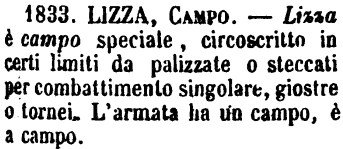 | Lizza, Campo - Lizza è campo speciale, circoscritto in certi limiti da palizzate o steccati per combattimento singolare, giostre o tornei. L'armata ha un campo, è a campo. [immagine] |