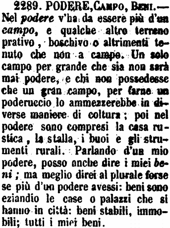 | Podere, Campo, Beni - Nel podere v'ha da essere più d'un campo, e qualche altro terreno prativo, boschivo o altrimenti tenuto che non a campo. Un solo campo per grande che sia non sarà mai podere, e chi non possedesse che un gran campo, per farne un poderuccio lo ammezzerebbe in diverse maniere di coltura; poi nel podere sono compresi la casa rustica, la stalla, i buoi e gli strumenti rurali. Parlando d'un mio podere, posso anche dire i miei beni; ma meglio direi al plurale forse se più d'un podere avessi: beni sono eziandio le case o palazzi che si hanno in città: beni stabili, immobili; tutti i miei beni. [immagine] |