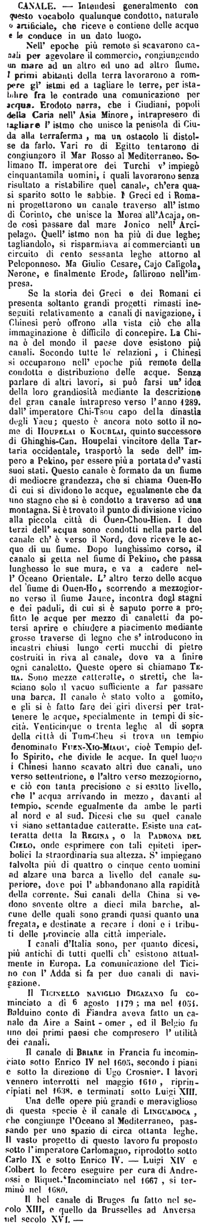 Nell'epoche più remote si scavarono canali per agevolare il commercio, congiungendo un mare ad un altro ed uno ad altro fiume. I primi abitanti della terra lavorarono a rompere gl'istmi ed a tagliare le terre, per istabilire fra le contrade una comunicazione per acqua. Erodoto narra, che i Ciudiani, popoli della Caria nell'Asia Minore, intrapresero di tagliare l'istmo che unisce la penisola di Ciuda alla terraferma, ma un ostacolo li distolse da farlo. Vari re di Egitto tentarono di congiungere il Mar Rosso al Mediterraneo. Solimano II. imperatore dei Turchi v'impiegò cinquantamila uomini, i quali lavorarono senza risultato a ristabilire quel canale, ch'era quasi sparito sotto le sabbie. I Greci ed i Romani progettarono un canale traverso all'istmo di Corinto, che unisce la Morea all'Acaja, onde così passare dal mare Jonico nell'Arcipelago. Quell'istmo non ha più di due leghe; tagliandolo, si risparmiava ai commercianti un circuito di cento sessanta leghe attorno al Peloponneso. Ma Giulio Cesare, Cajo Caligola, Nerone, e finalmente Erode, fallirono nell'impresa. Se la storia dei Greci e dei Romani ci presenta soltanto grandi progetti rimasti ineseguiti relativamente a canali di navigazione, i Chinesi però offrono alla vista ciò che alla immaginazione è difficile di concepire. La China è del mondo il paese dove esistono più canali. Secondo tutte le relazioni, i Chinesi si occuparono nell'epoche più remote della condotta e distribuzione delle acque. Senza parlare di altri lavori, si può farsi un'idea della loro grandiosità mediante la descrizione del gran canale intrapreso verso l'anno 1289. dall'imperatore Chi-Tsou capo della dinastia degli Yacu; questo è ancora noto sotto il nome di Houpelai o Koublai, quinto successore di Ghinghis-Can. Houpelai vincitore della Tartaria occidentale, trasportò la sede dell'impero a Pekino, per essere più a portata de' vasti suoi stati. Questo canale è formato da un fiume di mediocre grandezza, che si chiama Ouen-Ho di cui si dividono le acque, egualmente che da uno stagno che si è condotto a traverso ad una montagna. Si è trovato il punto di divisione vicino alla piccola città di Ouen-Chou-Hien. I due terzi dell'acqua sono condotti nella parte del canale ch'è verso il Nord, dove riceve le acque di un fiume. Dopo lunghissimo corso, il canale si getta nel fiume di Pekino, che passa lunghesso le sue mura, e va a cadere nell'Oceano Orientale. L'altro terzo delle acque del fiume di Ouen-Ho, scorrendo a mezzogiorno verso il fiume Jaune, incontra degli stagni e dei paduli, di cui si è saputo porre a profitto le acque per mezzo di canaletti da potersi aprire e chiudere a piacimento mediante grosse traverse di legno che s'introducono in incastri chiusi lungo certi mucchi di pietre costruiti in riva al canale, dove va a finire ogni canaletto. Queste opere si chiamano Teha. Sono mezze catteratte, o stretti, che lasciano solo il vacuo sufficiente a far passare una barca. Il canale è stato volto a gomito, e gli si è fatto fare dei giri diversi per trattenere le acque, specialmente in tempi di siccità. Venticinque o trenta leghe al di sopra della città di Tum-Cheu si trova un tempio denominato Fuen-Xio-Miaou, cioè Tempio dello Spirito, che divide le acque. In quel luogo i Chinesi hanno scavato altri due canali, uno verso settentrione, e l'altro verso mezzogiorno, e ciò con tanta precisione e sì esatto livello, che l'acqua arrivando in mezzo, davanti al tempio, scende egualmente da ambe le parti al nord e al sud. Dicesi che su quel canale vi siano settantadue catteratte. Esiste una catteratta detta la Regina, o la Padrona del Cielo, onde esprimere con tali epiteti iperbolici la straordinaria sua altezza. S'impiegano talvolta più di quattro o cinque cento uomini ad alzare una barca a livello del canale superiore, dove poi l'abbandonano alla rapidità della corrente. Sui canali della China si vedono sovente oltre a dieci mila barche, alcune delle quali sono grandi quasi quanto una fregata, e destinate a recare i doni e i tributi delle provincie alla città imperiale. I canali d'Italia sono, per quanto dicesi, più antichi di tutti quelli ch'esistono attualmente in Europa. La comunicazione del Ticino con l'Adda si fa per due canali di navigazione. Il Ticinello naviglio Digazano fu cominciato a dì 6 agosto 1179; ma nel 1054. Balduino conte di Fiandra aveva fatto un canale da Aire a Saint-omer, ed il Belgio fu uno dei primi paesi che compresero l'utilità dei canali. Il canale di Briare in Francia fu incominciato sotto Enrico IV nel 1605, secondo i piani e sotto la direzione di Ugo Crosnier. I lavori vennero interrotti nel maggio 1610, riprincipiati nel 1638. e terminati sotto Luigi XIII. Una delle opere più grandi e meravigliose di questa specie è il canale di Linguadoca, che congiunge l'Oceano al Mediterraneo, passando per uno spazio di circa ottanta leghe. Il vasto progetto di questo lavoro fu proposto sotto l'imperatore Carlomagno, riprodotto sotto Carlo IX e sotto Enrico IV. - Luigi XIV e Colbert lo fecero eseguire per cura di Andreossi e Riquet. Incominciato nel 1667, si terminò nel 1680. Il bel canale di Bruges fu fatto nel secolo XIII, e quello da Brusselles ad Anversa nel secolo XVI. - [immagine] |