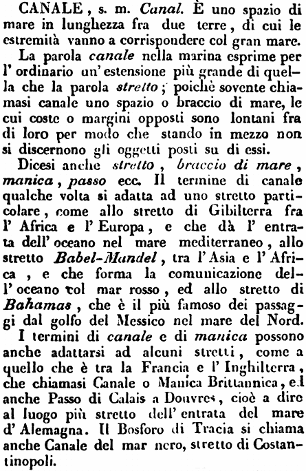 La parola canale nella marina esprime per l'ordinario un'estensione più grande di quella che la parola stretto; poichè sovente chiamasi canale uno spazio o braccio di mare, le cui coste o margini opposti sono lontani fra di loro per modo che stando in mezzo non si discernono gli oggetti posti su di essi. Dicesi anche stretto, braccio di mare, manica, passo ecc. Il termine di canale qualche volta si adatta ad uno stretto particolare, come allo stretto di Gibilterra fra l'Africa e l'Europa, e che dà l'entrata dell'oceano nel mare mediterraneo, allo stretto Babel-Mandel, tra l'Asia e l'Africa, e che forma la comunicazione dell'oceano col mar rosso, ed allo stretto di Bahamas, che è il più famoso dei passaggi dal golfo del Messico nel mare del Nord. I termini di canale e di manica possono anche adattarsi ad alcuni stretti, come a quello che è tra la Francia e l'Inghilterra, che chiamasi Canale o Manica Brittannica, ed anche Passo di Calais a Donvres, cioè a dire al luogo più stretto dell'entrata del mare d'Alemagna. Il Bosforo di Tracia si chiama anche Canale del mar nero, stretto di Costantinopoli. [immagine] |