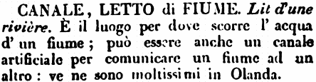 | Canale, Letto di fiume - Lit d'une rivière. È il luogo per dove scorre l'acqua d'un fiume; può essere anche un canale artificiale per comunicare un fiume ad un altro: ve ne sono moltissimi in Olanda. [immagine] |