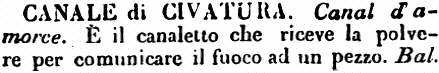 | Canale di civatura - Canal d'amorce. È il canaletto che riceve la polvere per comunicare il fuoco ad un pezzo. Bal. [immagine] |