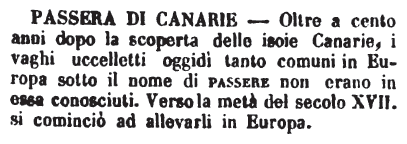 | Passera di Canarie - Oltre a cento anni dopo la scoperta delle isoie Canarie, i vaghi uccelletti oggidì tanto comuni in Europa sotto il nome di passere non erano in essa conosciuti. Verso la metà del secolo XVII. si cominciò ad allevarli in Europa. [immagine] |
