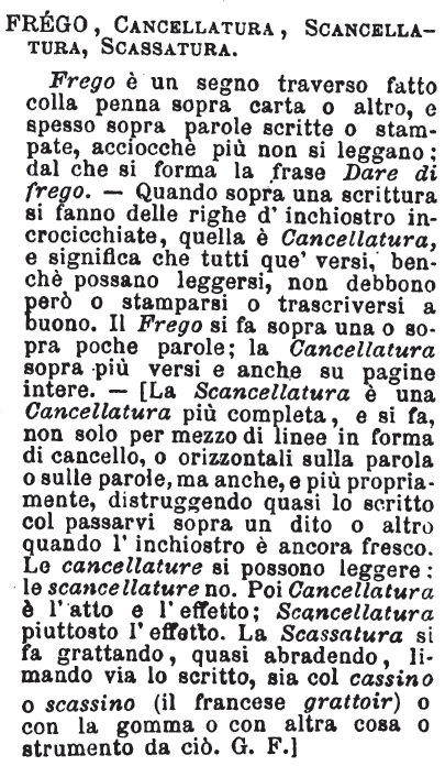 | Frego, Cancellatura, Scancellatura, Scassatura - Frego è un segno traverso fatto colla penna sopra carta o altro, e spesso sopra parole scritte o stampate, acciocchè più non si leggano; dal che si forma la frase Dare di frego. - Quando sopra una scrittura si fanno delle righe d'inchiostro incrocicchiate, quella è Cancellatura, e significa che tutti que' versi, benchè possano leggersi, non debbono però o stamparsi o trascriversi a buono. Il Frego si fa sopra una o sopra poche parole; la Cancellatura sopra più versi e anche su pagine intere. - [La Scancellatura è una Cancellatura più completa, e si fa, non solo per mezzo di linee in forma di cancello, o orizzontali sulla parola o sulle parole, ma anche, e più propriamente, distruggendo quasi lo scritto col passarvi sopra un dito o altro quando l'inchiostro è ancora fresco. Le cancellature si possono leggere; le scancellature no. Poi Cancellatura è l'atto e l'effetto; Scancellatura piuttosto l'effetto. La Scassatura si fa grattando, quasi abradendo, limando via lo scritto, sia col cassino o scassino (il francese grattoir) o con la gomma o con altra cosa o strumento da ciò. G. F.] [immagine] |