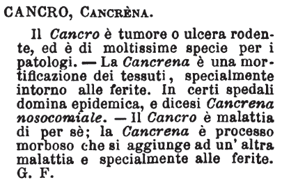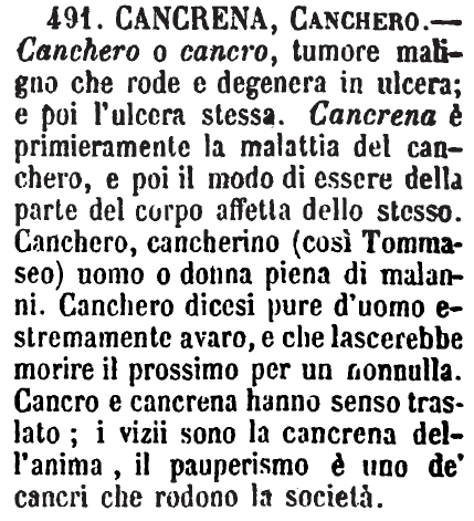 | Cancrena, Canchero - Canchero o cancro, tumore maligno che rode e degenera in ulcera; e poi l'ulcera stessa. Cancrena è primieramente la malattia del canchero, e poi il modo di essere della parte del corpo affetta dello stesso. Canchero, cancherino (così Tommaseo) uomo o donna piena di malanni. Canchero dicesi pure d'uomo estremamente avaro, e che lascerebbe morire il prossimo per un nonnulla. Cancro e cancrena hanno senso traslato; i vizii sono la cancrena dell'anima, il pauperismo è uno de' cancri che rodono la società. [immagine] |