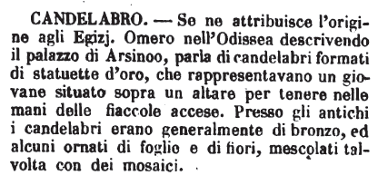 | Candelabro - Se ne attribuisce l'origine agli Egizj. Omero nell'Odissea descrivendo il palazzo di Arsinoo, parla di candelabri formati di statuette d'oro, che rappresentavano un giovane situato sopra un altare per tenere nelle mani delle fiaccole accese. Presso gli antichi i candelabri erano generalmente di bronzo, ed alcuni ornati di foglie e di fiori, mescolati talvolta con dei mosaici. [immagine] |