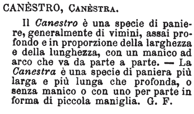 | Canestro, Canestra - Il Canestro è una specie di paniere, generalmente di vimini, assai profondo e in proporzione della larghezza e della lunghezza, con un manico ad arco che va da parte a parte. - La Canestra è una specie di paniera più larga e più lunga che profonda, o senza manico o con uno per parte in forma di piccola maniglia. G. F. [immagine] |