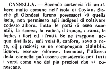 | Cannella - Seconda corteccia di un albero molto comune nell'isola di Ceylan. Sinchè gli Olandesi furono possessori di quella isola, non permisero agli indigeni di coltivare codesto albero. Tutte le parti di esso sono utili, la scorza, la radica, il tronco, i rami, le foglie, i fiori ed i frutti. Se ne traggono acque distillate, sali volatili, canfora, sevo o cera, olj preziosi; se ne compongono giulebbi, liquori, essenze odorose. Insomma, l'albero della cannella può essere considerato per tutti i versi come uno dei più preziosi che si conoscano. [immagine] |