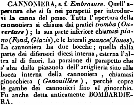 | Cannoniera - s. f. Embrasure. Quell'apertura che si fa nei parapetti per introdurvi la canna del pezzo. Tutta l'apertura della cannoniera si chiama dai pratici tromba (Ouverture); la sua parte inferiore chiamasi piano (Fond, Glacis), e le laterali guance (Joues). La cannoniera ha due bocche; quella dalla parte dei difensori dicesi interna, esterna l'altra al di fuori. La porzione di parapetto che s'alza dalla piazzuola dell'artiglieria sino alla bocca interna della cannoniera, chiamasi ginocchiera (Genouillère), perchè copre le gambe dei cannonieri fino al ginocchio. Fu anche detta anticamente BOMBARDIERA. [immagine] |