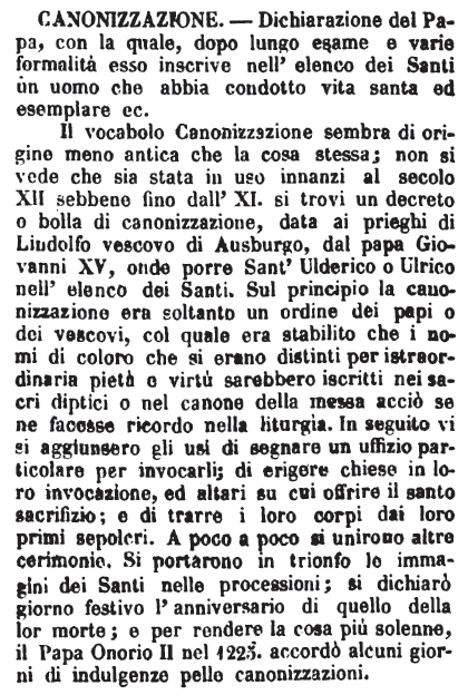 Il vocabolo Canonizzazione sembra di origine meno antica che la cosa stessa; non si vede che sia stata in uso innanzi al secolo XII sebbene fino dall'XI. si trovi un decreto o bolla di canonizzazione, data ai prieghi di Lindolfo vescovo di Ausburgo, dal papa Giovanni XV, onde porre Sant'Ulderico o Ulrico nell'elenco dei Santi. Sul principio la canonizzazione era soltanto un ordine dei papi o dei vescovi, col quale era stabilito che i nomi di coloro che si erano distinti per istraordinaria pietà e virtù sarebbero iscritti nei sacri diptici o nel canone della messa acciò se ne facesse ricordo nella liturgia. In seguito vi si aggiunsero gli usi di segnare un uffizio particolare per invocarli; di erigere chiese in loro invocazione, ed altari su cui offrire il santo sacrifizio; e di trarre i loro corpi dai loro primi sepolcri. A poco a poco si unirono altre cerimonie. Si portarono in trionfo le immagini dei Santi nelle processioni; si dichiarò giorno festivo l'anniversario di quello della lor morte; e per rendere la cosa più solenne, il Papa Onorio II nel 1225, accordò alcuni giorni di indulgenze pelle canonizzazioni. [immagine] |