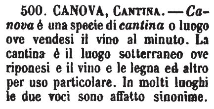 | Canova, Cantina - Canova è una specie di cantina o luogo ove vendesi il vino al minuto. La cantina è il luogo sotterraneo ove riponesi e il vino e le legna ed altro per uso particolare. In molti luoghi le due voci sono affatto sinonime. [immagine] |