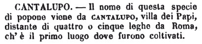 | Cantalupo - Il nome di questa specie di popone viene da cantalupo, villa dei Papi, distante di quattro o cinque leghe da Roma, ch'è il primo luogo dove furono coltivati. [immagine] |