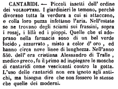 Il romanzo della fanciulla di Matilde Serao (1921): L'anno scorso, di marzo, ella ha comperato, in tre volte, dallo speziale, tre paste di cantaridi per vescicanti, col pretesto di infermità: e le ha mangiate tutte tre. Ella ha sofferto due giorni di spasimi atroci, si è pentita di quel suicidio, ha invocato le sorelle, i fratelli, le amiche: ma non è stato possibile di salvarla. Dopo morta, hanno ritrovato il suo giornale; non avendo neppure a chi scrivere le sue pene, ella si dirigeva a un essere immaginario. Il giornale è stato mandato alla sorella più grande; esso è straziante.