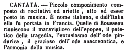 | Cantata - Piccolo componimento composto di recitativi ed ariette, atto ad esser posto in musica. E' nome italiano, e dall'Italia ella fu portata in Francia. Quelle di Rousseau riuniscono il maraviglioso dell'epopea, il patetico della tragedia, l'entusiasmo dell'onde pindarica, il grazioso dell'ode anacreontica, e l'armonia della musica. [immagine] |