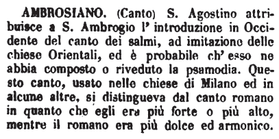 | Ambrosiano (canto) - S. Agostino attribuisce a S. Ambrogio l'introduzione in Occidente del canto dei salmi, ad imitazione delle chiese Orientali, ed è probabile ch'esso ne abbia composto o riveduto la psamodia. Questo canto, usato nelle chiese di Milano ed in alcune altre, si distingueva dal canto romano in quanto che egli era più forte o più alto, mentre il romano era più dolce ed armonico. [immagine] |