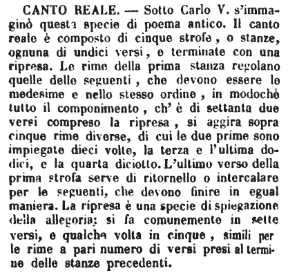 | Canto reale - Sotto Carlo V. s'immaginò questa specie di poema antico. Il canto reale è composto di cinque strofe, o stanze, ognuna di undici versi, e terminate con una ripresa. Le rime della prima stanza regolano quelle delle seguenti, che devono essere le medesime e nello stesso ordine, in modochè tutto il componimento, ch'è di settanta due versi compreso la ripresa, si aggira sopra cinque rime diverse, di cui le due prime sono impiegate dieci volte, la terza e l'ultima dodici, e la quarta diciotto. L'ultimo verso della prima strofa serve di ritornello o intercalare per le seguenti, che devono finire in egual maniera. La ripresa è una specie di spiegazione della allegoria; si fa comunemente in sette versi, e qualche volta in cinque, simili per le rime a pari numero di versi presi al termine delle stanze precedenti. [immagine] |