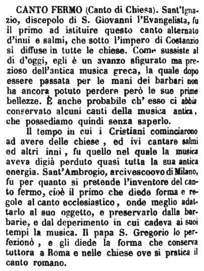 Canto fermo (canto di chiesa) - Sant'Ignazio, discepolo di S. Giovanni l'Evangelista, fu il primo ad istituire questo canto alternato d'inni e salmi, che sotto l'impero di Costanzio si diffuse in tutte le chiese. Come sussiste al di d'oggi, egli è un avanzo sfigurato ma prezioso dell'antica musica greca, la quale dopo essere passata per le mani dei barbari non ha ancora potuto perdere però le sue prime bellezze. È anche probabile ch'esso ci abbia conservato alcuni canti della musica antica, che possediamo quindi senza saperlo.