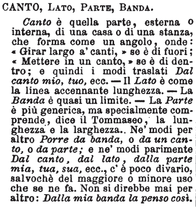 | Canto, Lato, Parte, Banda - Canto è quella parte, esterna o interna, di una casa o di una stanza, che forma come un angolo, onde: « Girar largo a' canti, » se è di fuori; « Mettere in un canto, » se è di dentro; e quindi i modi traslati Dal canto mio, tuo, ecc. - Il Lato è come la linea accennante lunghezza. - La Banda è quasi un limite. - La Parte è più generica, ma specialmente comprende, dice il Tommaseo, la lunghezza e la larghezza. Ne' modi per altro Porre da banda, o da un canto, o da parte; e ne' modi parimente Dal canto, dal lato, dalla parte mia, tua, sua, ecc., c'è poco divario, salvochè del maggiore o minore uso che se ne fa. Non si direbbe mai per altro: Dalla mia banda la penso così. [immagine] |