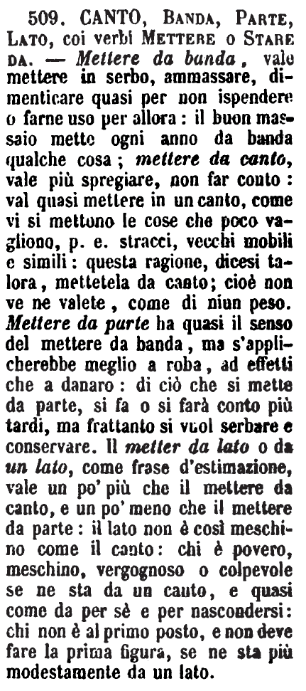 | Canto, Banda, Parte, Lato, coi verbi Mettere o Stare da - Mettere da banda, vale mettere in serbo, ammassare, dimenticare quasi per non ispendere o farne uso per allora: il buon massaio mette ogni anno da banda qualche cosa; mettere da canto, vale più spregiare, non far conto: val quasi mettere in un canto, come vi si mettono le cose che poco vagliono, p. e. stracci, vecchi mobili e simili: questa ragione, dicesi talora, mettetela da canto; cioè non ve ne valete, come di niun peso. Mettere da parte ha quasi il senso del mettere da banda, ma s'applicherebbe meglio a roba, ad effetti che a danaro: di ciò che si mette da parte, si fa o si farà conto più tardi, ma frattanto si vuol serbare e conservare. Il metter da lato o da un lato, come frase d'estimazione, vale un po' più che il mettere da canto, e un po' meno che il mettere da parte: il lato non è così meschino come il canto: chi è povero, meschino, vergognoso o colpevole se ne sta da un canto, e quasi come da per sè e per nascondersi: chi non è al primo posto, e non deve fare la prima figura, se ne sta più modestamente da un lato. [immagine] |