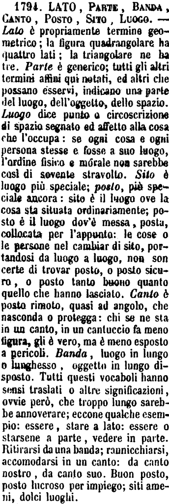| Lato, Parte, Banda, Canto, Posto, Sito, Luogo - Lato è propriamente termine geometrico; la figura quadrangolare ha quattro lati; la triangolare ne ha tre. Parte è generico; tutti gli altri termini affini qui notati, ed altri che possano esservi, indicano una parte del luogo, dell'oggetto, dello spazio. Luogo dice punto o circoscrizione di spazio segnato ed affetto alla cosa che l'occupa: se ogni cosa e ogni persona stesse e fosse a suo luogo, l'ordine fisico e morale non sarebbe così di sovente stravolto. Sito è luogo più speciale; posto, più speciale ancora: sito è il luogo ove la cosa sta situata ordinariamente; posto è il luogo dov'è messa, posta, collocata per l'appunto: le cose o le persone nel cambiar di sito, portandosi da luogo a luogo, non son certe di trovar posto, o posto sicuro, o posto tanto buono quanto quello che hanno lasciato. Canto è posto rimoto, quasi ad angolo, che nasconda o protegga: chi se ne sta in un canto, in un cantuccio fa meno figura, gli è vero, ma è meno esposto a pericoli. Banda, luogo in lungo o lunghesso, oggetto in lungo disposto. Tutti questi vocaboli hanno sensi traslati o altre significazioni, ovvie però, che troppo lungo sarebbe annoverare; eccone qualche esempio: essere, stare a lato: essere o starsene a parte, vedere in parte. Ritirarsi da una banda; rannicchiarsi, accomodarsi in un canto: da canto nostro, da canto suo. Buon posto, posto lucroso per impiego; siti ameni, dolci luoghi. [immagine] |