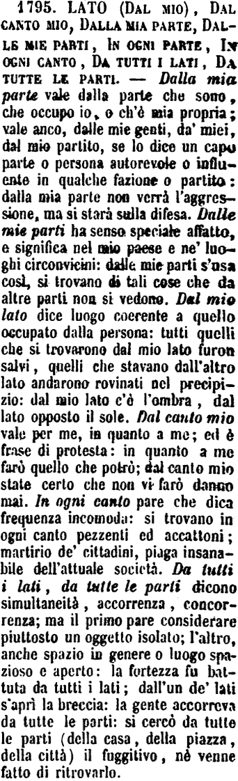 | Lato (Dal mio), Dal canto mio, Dalla mia parte, Dalle mie parti, In ogni parte, In ogni canto, Da tutti i lati, Da tutte le parti - Dalla mia parte vale dalla parte che sono, che occupo io, o ch'è mia propria; vale anco, dalle mie genti, da' miei, dal mio partito, se lo dice un capo parte o persona autorevole o influente in qualche fazione o partito: dalla mia parte non verrà l'aggressione, ma si starà sulla difesa. Dalle mie parti ha senso speciale affatto, e significa nel mio paese e ne' luoghi circonvicini: dalle mie parti s'usa così, si trovano di tali cose che da altre parti non si vedono. Dal mio lato dice luogo coerente a quello occupato dalla persona: tutti quelli che si trovarono dal mio lato furon salvi, quelli che stavano dall'altro lato andarono rovinati nel precipizio: dal mio lato c'è l'ombra, dal lato opposto il sole. Dal canto mio vale per me, in quanto a me; ed è frase di protesta: in quanto a me farò quello che potrò; dal canto mio state certo che non vi farò danno mai. In ogni canto pare che dica frequenza incomoda: si trovano in ogni canto pezzenti ed accattoni; martirio de' cittadini, piaga insanabile dell'attuale società. Da tutti i lati, da tutte le parti dicono simultaneità, accorrenza, concorrenza; ma il primo pare considerare piuttosto un oggetto isolato; l'altro, anche spazio in genere o luogo spazioso e aperto: la fortezza fu battuta da tutti i lati; dall'un de' lati s'aprì la breccia: la gente accorreva da tutte le parti: si cercò da tutte le parti (della casa, della piazza, della città) il fuggitivo, nè venne fatto di ritrovarlo. [immagine] |