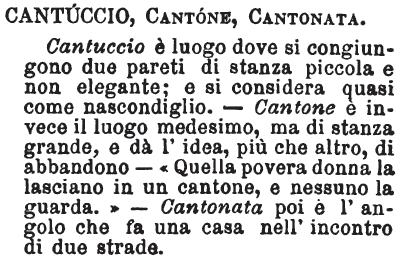 | Cantuccio, Cantone, Cantonata - Cantuccio è luogo dove si congiungono due pareti di stanza piccola e non elegante; e si considera quasi come un nascondiglio. - Cantone è invece il luogo medesimo, ma di stanza grande, e dà l'idea, più che altro, di abbandono - « Quella povera donna la lasciano in un cantone, e nessuno la guarda. » - Cantonata poi è l'angolo che fa una casa nell'incontro di due strade. [immagine] |