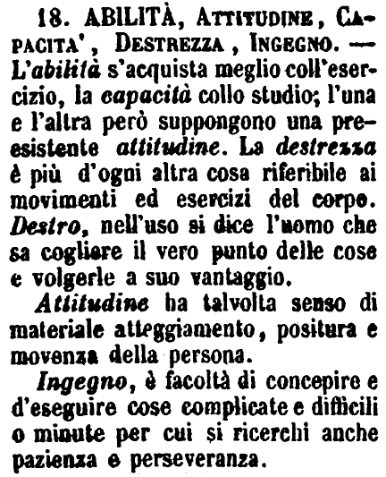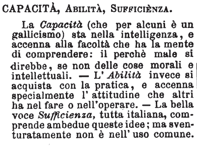 | Capacità, Abilità, Sufficienza - La Capacità (che per alcuni è un gallicismo) sta nella intelligenza, e accenna alla facoltà che ha la mente di comprendere: il perchè male si direbbe, se non delle cose morali e intellettuali. - L'Abilità invece si acquista con la pratica, e accenna specialmente l'attitudine che altri ha nel fare o nell'operare. - La bella voce Sufficienza, tutta italiana, comprende ambedue queste idee; ma sventuratamente non è nell'uso comune. [immagine] |