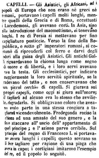 | Capelli - Quasi tutti i Popoli antichi, generalmente parlando, si tagliavano i Capelli a misura che crescevano, e non vi era altra differenza in quest'uso sennonchè di lasciarli più o meno lunghi a seconda del costume particolare di ciascun Paese. Gli uomini riguardavano come indegna di loro la cura, che sarebbe occorsa per acconciarsi e ben conservarsi i Capelli, perchè sarebbe lor rincresciuto impiegarvi assai tempo nel doverseli così accomodare. Era dunque più speditivo il tagliarli; e così i Romani si servivano della espressione Caesaries, che sembrava indicare l'obbligo di aver sempre le cesoje in mano onde disfarsene. Plinio nel determinar l'epoca del primo stabilimento dei Barbieri in Roma, cioè nel 404. dalla fondazione della Città, dice che avanti quel tempo i Romani erano intonsi; epiteto, che molti Autori danno anche ai Romani de' primi secoli; lo che ha fatto credere che in quel tempo si lasciassero crescere i loro Capelli. Ma oltre che Plinio in questo luogo sembra non parlar che dell'uso, il qual s'introdusse, di farsi radere il volto, e che d'altronde è verosimile che intonsi non sia relativo che all'uso contrario, stato fin'allora mantenuto di portare la barba, è altresì certo che intonsus è talvolta sinonimo d'hirsutus, come tonsus lo è di compositus; dimodochè l'epiteto intonsi, se si vuole intendere dei Capelli, non indicherebbe che il modo ineguale e grossolano, con cui si tagliavano, in opposizione all'arte, con cui i tonsores sapevan tagliarli dando al rimanente di quelli un'aria di proprietà ed anche di grazia. Comunque ciò sia, era rarissimo in Roma, ed in Grecia ancora, che si facessero rader la testa, se si eccettuino i Filosofi, che per l'istesso spirito di particolarità o piuttosto di contraddizione portavano una lunga barba, mentre gli altri se la facevano radere.