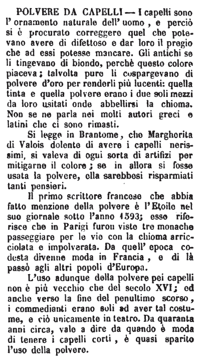 Si legge in Brantome, che Margherita di Valois dolente di avere i capelli nerissimi, si valeva di ogni sorta di artifizi per mitigarne il colore; se in allora si fosse usata la polvere, ella sarebbesi risparmiati tanti pensieri. Il primo scrittore francese che abbia fatto menzione della polvere è l'Etoile nel suo giornale sotto l'anno 1593; esso riferisce che in Parigi furon viste tre monache passeggiare per le vie con la chioma arricciolata e impolverata. Da quell'epoca codesta divenne moda in Francia, e di là passò agli altri popoli d'Europa. L'uso adunque della polvere pei capelli non è più vecchio che del secolo XVI; ed anche verso la fine del penultimo scorso, i commedianti erano soli ad aver tal costume, e ciò unicamente in teatro. Da quaranta anni circa, vale a dire da quando è moda di tenere i capelli corti, è quasi sparito l'uso della polvere. [immagine] |