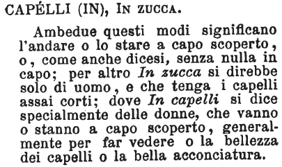 | Capelli (In), In Zucca - Ambedue questi modi significano l'andare o lo stare a capo scoperto, o, come anche dicesi, senza nulla in capo; per altro In zucca si direbbe solo di uomo, e che tenga i capelli assai corti; dove In capelli si dice specialmente delle donne, che vanno o stanno capo scoperto, generalmente per far vedere o la bellezza dei capelli o la bella acconciatura. [immagine] |