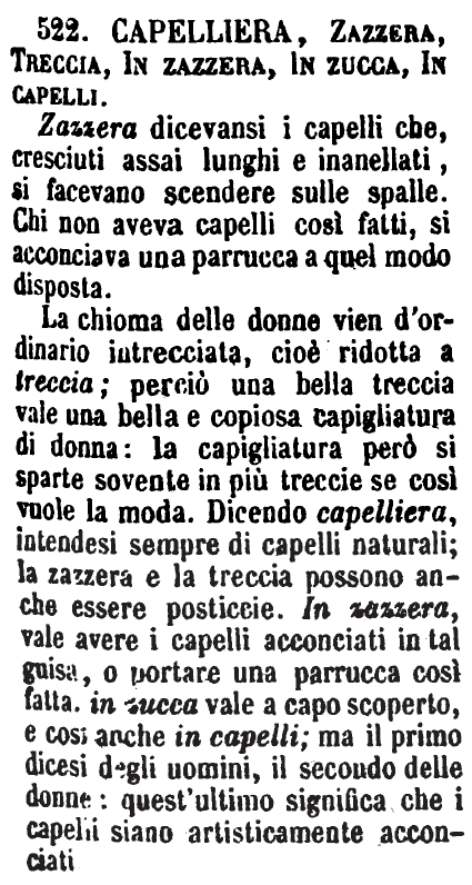| Capelliera, Zazzera, Treccia, In zazzera, In zucca, In capelli - Zazzera dicevansi i capelli che, cresciuti assai lunghi e inanellati, si facevano scendere sulle spalle. Chi non aveva capelli così fatti, si acconciava una parrucca a quel modo disposta.