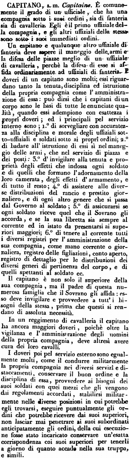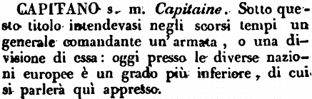 Capitano - s. m. Capitaine. È comunemente il grado di un ufficiale, che ha una compagnia sotto i suoi ordini, sia di fanteria sia di cavalleria. Egli è il primo uffiziale della compagnia, e gli altri uffiziali della stessa sono sotto i suoi immediati ordini.