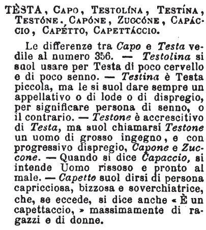 | Testa, Capo, Testolina, Testina, Testone, Capone, Zuccone, Capaccio, Capetto, Capettaccio - Le differenze tra Capo e Testa vedile al numero 356. - Testolina si suol usare per Testa di poco cervello e di poco senno. - Testina è Testa piccola, ma le si suol dare sempre un appellativo o di lode o di dispregio, per significare persona di senno, o il contrario. - Testone è accrescitivo di Testa, ma suol chiamarsi Testone un uomo di grosso ingegno, e con progressivo dispregio, Capone e Zuccone. - Quando si dice Capaccio, si intende Uomo rissoso e pronto al male. - Capetto suol dirsi di persona capricciosa, bizzosa e soverchiatrice, che, se eccede, si dice anche «È un capettaccio,» massimamente di ragazzi e di donne. [immagine] |