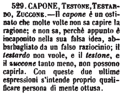 | Capone, Testone, Testardo, Zuccone - Il capone è un ostinato che molte volte non sa capire la ragione; e non sa, perchè appunto è incaponito nella sua falsa idea, abbarbagliato da un falso raziocinio; il testardo non vuole, e il testone, e il zuccone tanto meno, non possono capirla. Con queste due ultime espressioni s'intende proprio qualificare persona di mente ottusa. [immagine] |