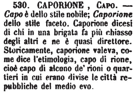| Caporione, Capo - Capo è dello stile nobile; Caporione dello stile faceto. Caporione dicesi di chi in una brigata fa più chiasso degli altri e ne è quasi direttore. Storicamente, caporione valeva, come dice l'etimologia, capo di rione, cioè capo di alcuno de' rioni o quartieri in cui erano divisi le città repubbliche del medio evo. [immagine] |