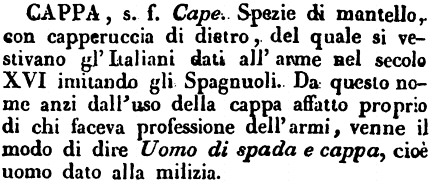 | Cappa - s. f. Cape. Spezie di mantello, con capperuccia di dietro, del quale si vestivano gl'Italiani dati all'arme nel secolo XVI imitando gli Spagnuoli. Da questo nome anzi dall'uso della cappa affatto proprio di chi faceva professione dell'armi, venne il modo di dire Uomo di spada e cappa, cioè uomo dato alla milizia. [immagine] |