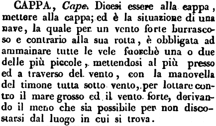 | Cappa - Cape. Dicesi essere alla cappa, mettere alla cappa; ed è la situazione di una nave, la quale per un vento forte burrascoso e contrario alla sua rotta, è obbligata ad ammainare tutte le vele fuorchè una o due delle più piccole, mettendosi al più presso ed a traverso del vento, con la manovella del timone tutta sotto vento, per lottare contro il mare grosso ed il vento forte, derivando il meno che sia possibile per non discostarsi dal luogo in cui si trova. [immagine] |